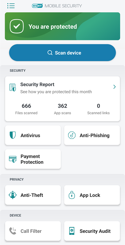 ESET Mobile Security for Android is a complete security solution for your Android device. With advanced protection against digital threats, this antivirus ensures that your data and privacy remain safe. This application protects your device against malware, ransomware, and other online threats. It also provides real-time monitoring to block any suspicious activity. If you are looking for a reliable and lightweight security solution, ESET Mobile Security is the ideal choice.